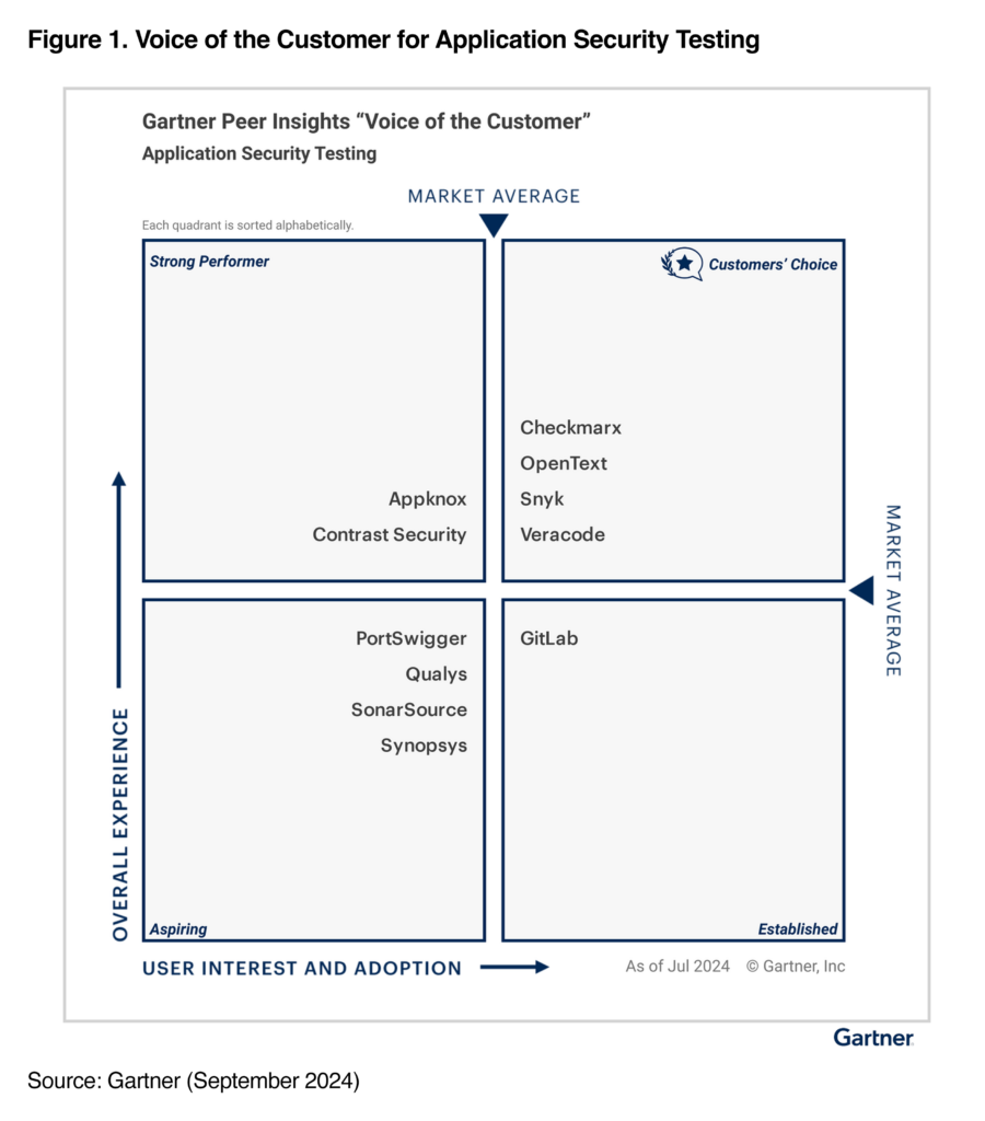 We are proud to announce that we are recognized with a Customers’ Choice distinction in the 2024 Peer Insights “Voice of the Customer”: Application Security Testing on Gartner® Peer Insights™. A Customers’ Choice vendor meets or exceeds both the market average Overall Experience and the market average User Interest and Adoption. We are even more proud to have been recognized with this distinction for the past six years – making us the only AST provider to be named a Customers’ Choice every year since the first Voice of the Customer for Application Security Testing report in 2019. In addition, this year Checkmarx (4.8/5) rated higher than Snyk (4.7/5) and OpenText (4.7/5) in Support Experience in the Application Security Testing Market based on 120 reviews on Gartner Peer Insights™ as of July 2024. Hear what our reviewers had to say on Gartner Peer Insights*: “Checkmarx One has been an invaluable tool in strengthening our software development security practices, giving us confidence that our code is robust and secure. The combination of accuracy, efficiency and ease of use has greatly improved our ability to proactively and efficiently manage security risks.”* – IT Security and Risk Management Manager “The experience from research to procurement was seamless. The features Checkmarx offered were a clear winner.” - Cybersecurity Governance & Risk Manager This distinction is a particularly big deal for everyone at Checkmarx because it comes from customers — who are the reason we do what we do. The Gartner Peer Insights Voice of the Customer report recognizes vendors in this market based on reviews from verified end users. Vendors placed in the upper-right quadrant of the “Voice of the Customer” graphic are recognized with the Gartner Peer Insights Customers’ Choice distinction, denoted with a Customers’ Choice badge. The recognized vendors meet or exceed both the market average Overall Experience and the market average User Interest and Adoption. The “Voice of the Customer” is a document that synthesizes Gartner Peer Insights reviews into insights for buyers of technology and services. This aggregated peer perspective, along with the individual detailed reviews, is complementary to Gartner expert research and can play a key role in your buying process. Read more reviews for Checkmarx here. READY TO LEARN MORE? Download a complimentary copy of the Voice of the Customer for Application Security Testing or visit us online for additional information on Checkmarx One. To all our customers who submitted reviews, thank you! You’re the reason we are here, and your feedback helps us improve our products to fit your needs. If you have a Checkmarx story to share, we encourage you to join the Gartner Peer Insights crowd and weigh in here. Gartner, Voice of the Customer for Application Security Testing, Peer Contributors, 27 September 2024. *Reviews have been edited to account for errors and readability. GARTNER is a registered trademark and service mark, and the GARTNER PEER INSIGHTS CUSTOMERS’ CHOICE badge and PEER INSIGHTS are trademarks and service marks, of Gartner, Inc. and/or its affiliates in the U.S. and internationally and are used herein with permission. All rights reserved. Gartner Peer Insights content consists of the opinions of individual end users based on their own experiences with the vendors listed on the platform, should not be construed as statements of fact, nor do they represent the views of Gartner or its affiliates. Gartner does not endorse any vendor, product or service depicted in this content nor makes any warranties, expressed or implied, with respect to this content, about its accuracy or completeness, including any warranties of merchantability or fitness for a particular purpose. This graphic was published by Gartner, Inc. as part of a larger research document and should be evaluated in the context of the entire document. The Gartner document is available upon request from Checkmarx.